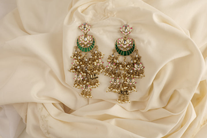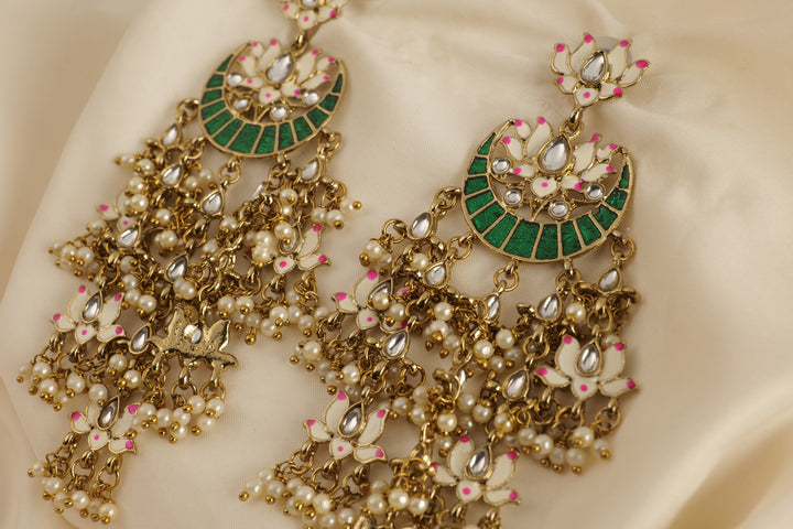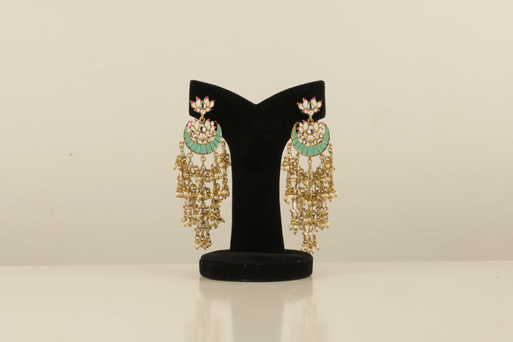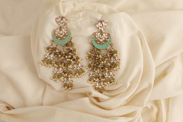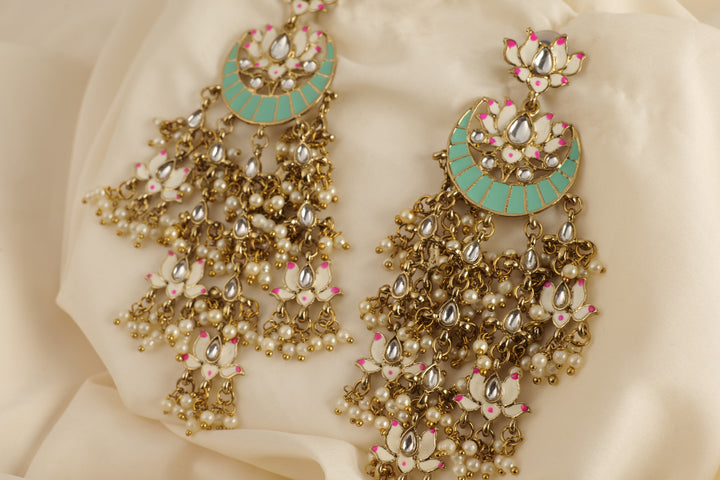 Delicate lotus motifs, pearl clusters, and a soft aqua touch create earrings that glow with timeless charm and modern elegance.