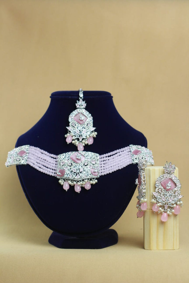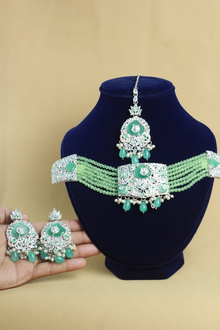 Exquisitely handcrafted Gulband Choker Set featuring premium zircone and carefully selected stones. This elegant piece showcases superior artisanship with precision-set embellishments, creating a sophisticated statement accessory that elevates both traditional and contemporary attire. Perfect for special occasions or as a treasured addition to fine jewelry collections.
