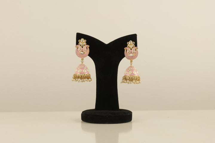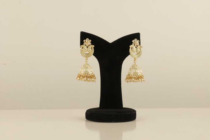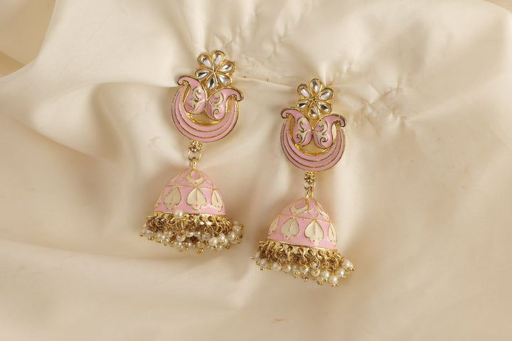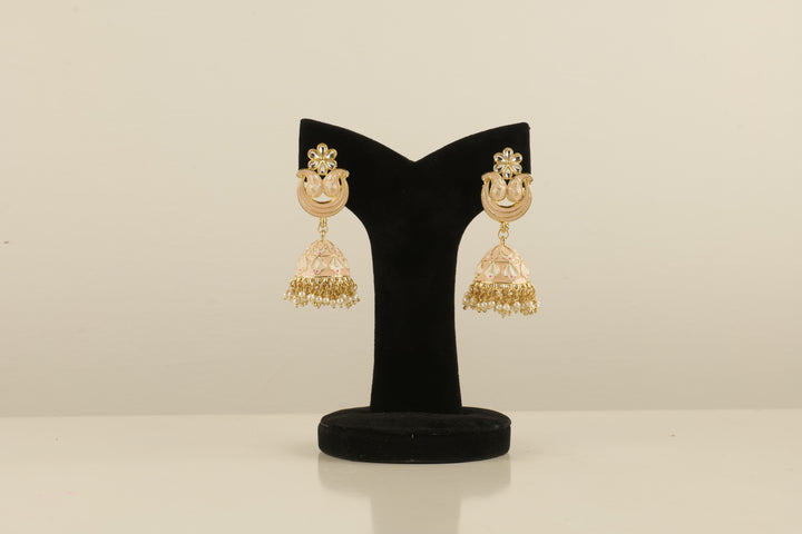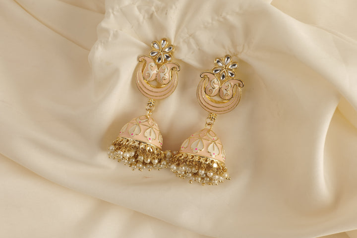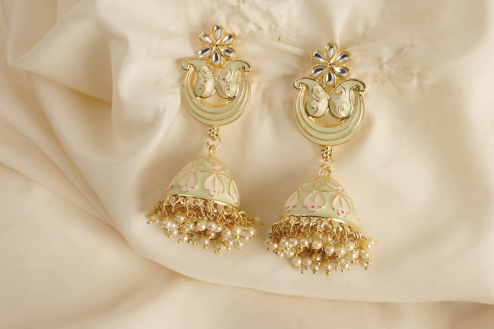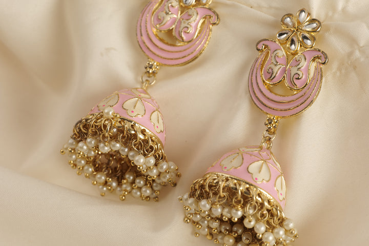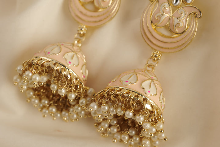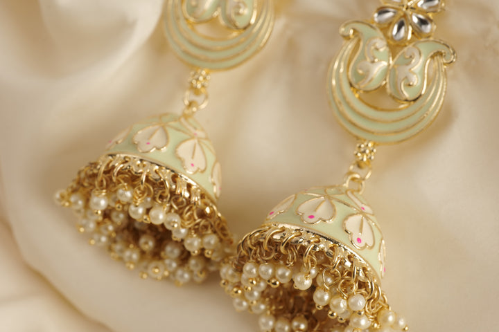 Delicate pastel enamel paired with golden finish and pearl clusters, perfect for weddings or celebrations.