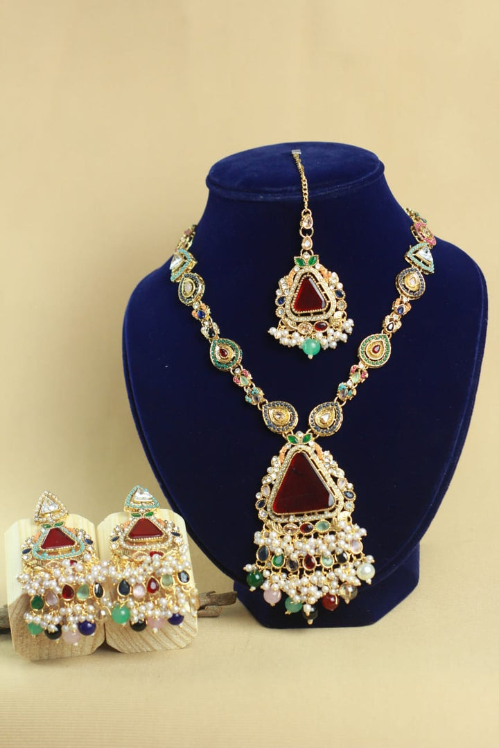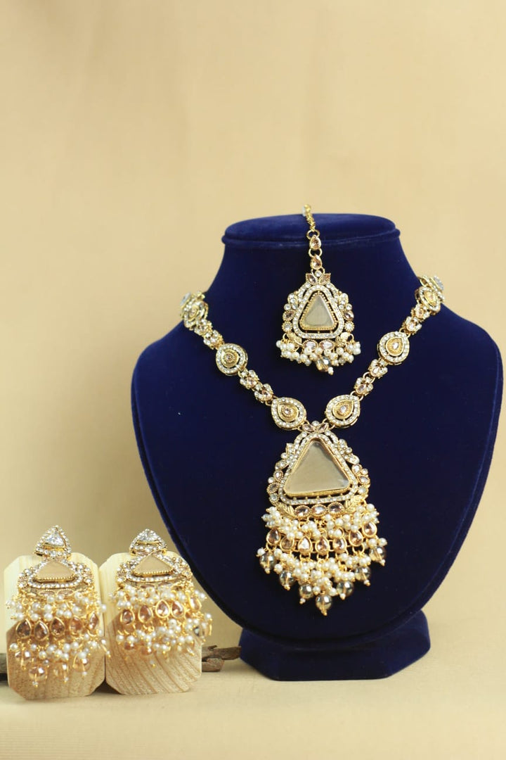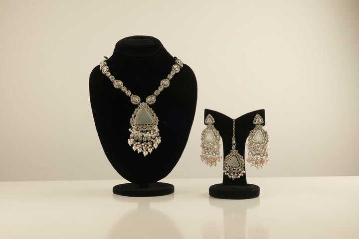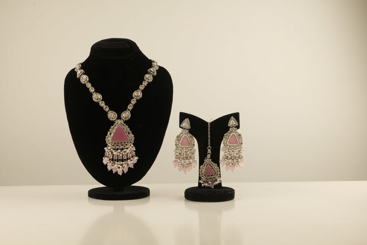 Meticulously handcrafted, the Satrangi Necklace Set showcases an opulent arrangement of lustrous pearls complemented by brilliant zircon stones. This exquisite piece demonstrates superior artisanship, with each pearl and zircon carefully positioned to create a sophisticated adornment suitable for special occasions and formal events.