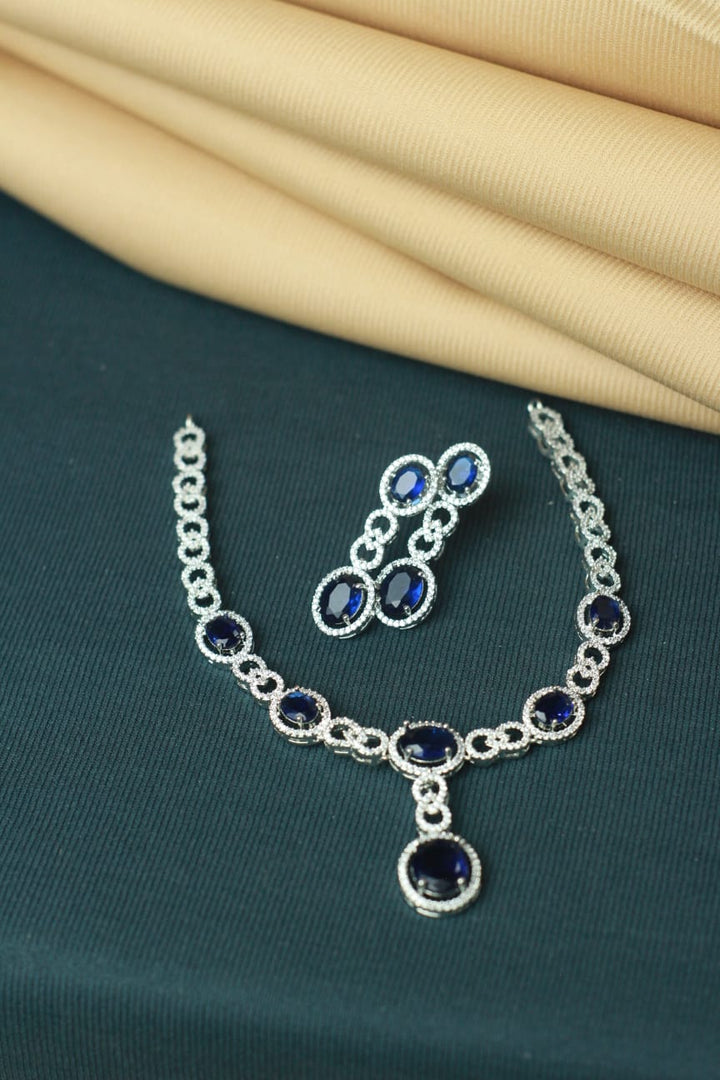 Elevate your evening attire with the Mid-Night Radiance set, featuring precision-cut American diamonds meticulously arranged in a hand-crafted maala design. This exquisite jewelry piece captures and reflects light with sophisticated brilliance, making it an ideal statement accessory for formal occasions and celebrations.